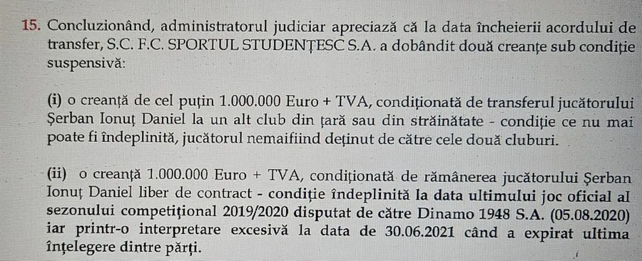 Administratorul judiciar al SC Dinamo 1948 SA a respins cererea de creanță curentă, în valoare de un milion de euro, solicitată de Vasile Șiman în baza contractului dintre „câini” și Sportul, din 2013, în urma transferului lui Ionuț Șerban. RTZ a transmis instanței că Sportul Studențesc, de la care omul de afaceri a cesionat creanța în 2015, ar fi trebuit să se adreseze în dosarul insolvenței SC Dinamo din 2014. Mai mult, practicienii au descoperit că, în 2020, Ionuț Șerban a rămas, pentru prima oară, liber de contract și, din această postură, a parafat o nouă înțelegere cu Dinamo. Acest detaliu ar putea schimba datele problemei în procesul care se va naște în dosarul de insolvență.