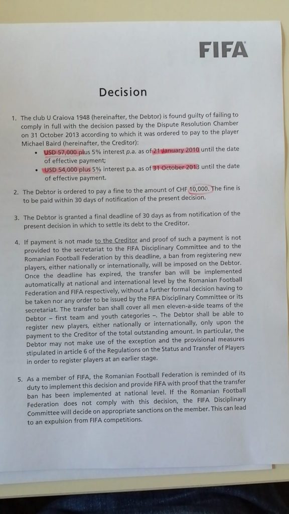 Cum Adrian Mititelu și-a asumat plata către Josh Mitchell este de așteptat că patronul echipei din Bănie să plătească acum și amenzile primite pentru Baird și Rose. Este știut faptul că finanțatorul echpei alb-albaștrilor este dispus să facă orice sacrificiu financiar pentru echipa care a fost recunoscută de FIFA ca fiind drept continuatoarea Universității Craiova.