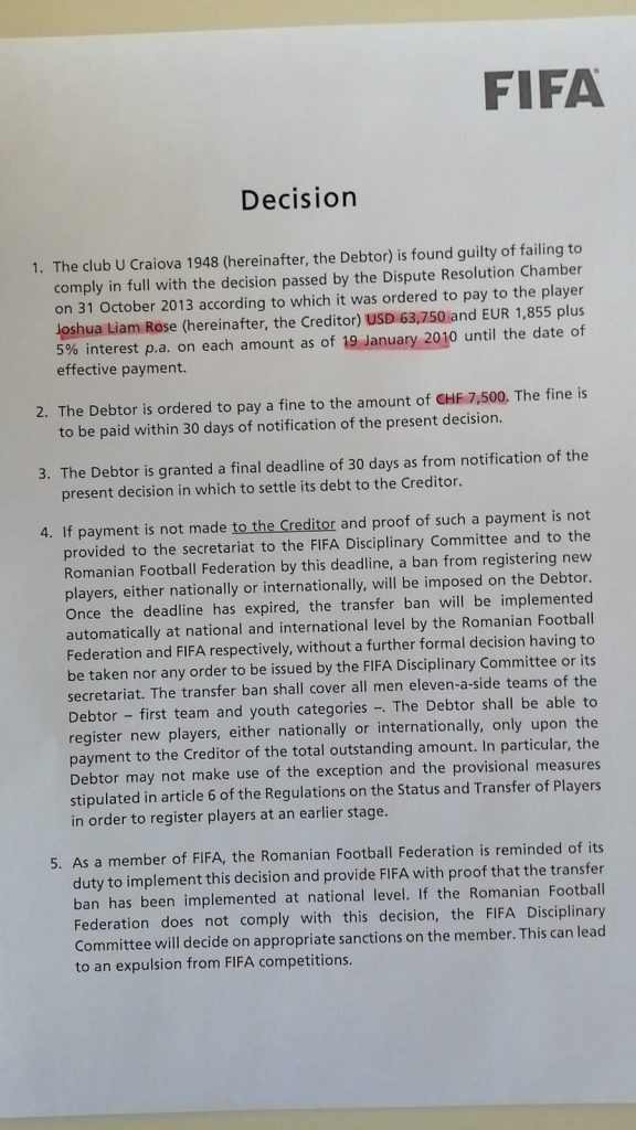 Însă, din păcate pentru patronul lui FC U Craiova plățile pentru amenzi nu se opresc aici. ProSport vă oferă documentele oficiale și cu sumele pe care finanțatorul clubului din Bănie trebuie să le achite către Rose și Baird. Astfel, după ce FIFA a anunțat că echipa pregătită de Trică este continuatoarea Universității Craiova, Mititelu trebuie să plătească acum alți 280 de mii de euro către fostul fundaș stânga, dar și către fostul atacant..