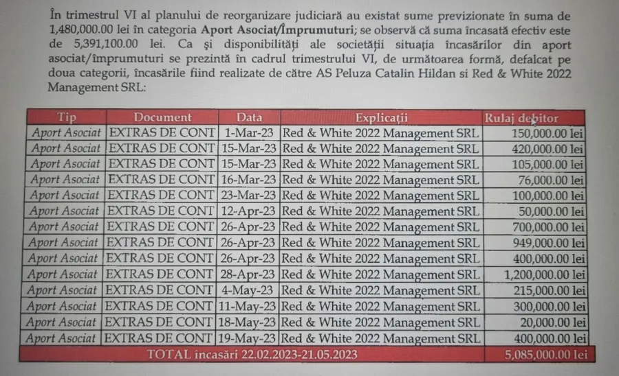 O altă informație publicată în exclusivitate de ProSport este legată de suma pe care a virat-o noul acționar majoritar în conturile SC Dinamo 1948 SA. Un milion de euro este valoarea aportului Red&White 2022 Management, prin împrumuturi, din momentul în care preluat pachetul majoritar de acțiuni de la Lotus (72,8%), plus felia de 8% de la Asociația Peluza Cătălin Hîldan, și până la finalul lunii mai, mai precis 21 mai, atât cât s-a întins trimestrul 6 al implementării planului de reorganizare al SC Dinamo 1948 SA.