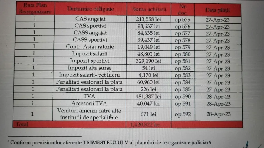 Conform informațiilor ProSport, care au la bază sume oficiale prezentate în fața instanței conform rapoartelor trimestriale, tranșa de 1.420.816 lei destinată trimestrului VI, către creditorului Direcția Generală a Finanțelor Publice București nu a fost achitată și, astfel, debitoarea a intrat într-o întârziere riscantă. Motivul transmis judecătorului sindic? „Din lipsa disponibilităților bănești”. (VEZI CAPTURĂ JOS!)