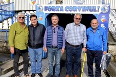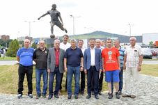 Dorin Nicșa, alături de Mircea Lucescu, Romulus Gabor și primarul Hunedoarei, Dan Bobouțanu, la statuia regretatului Michael Klein