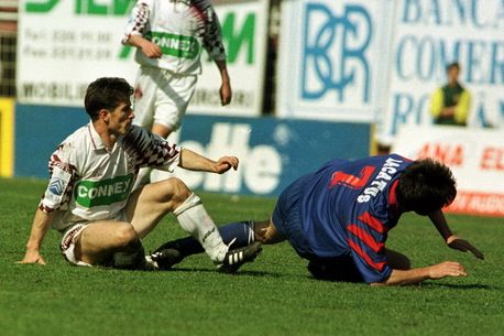 Fază din meciul disputat pe 1 aprilie 1998, Rapid-Steaua 1-1. Nanu (în stânga) nu se sfia să-l faulteze pe durul Lăcătuș