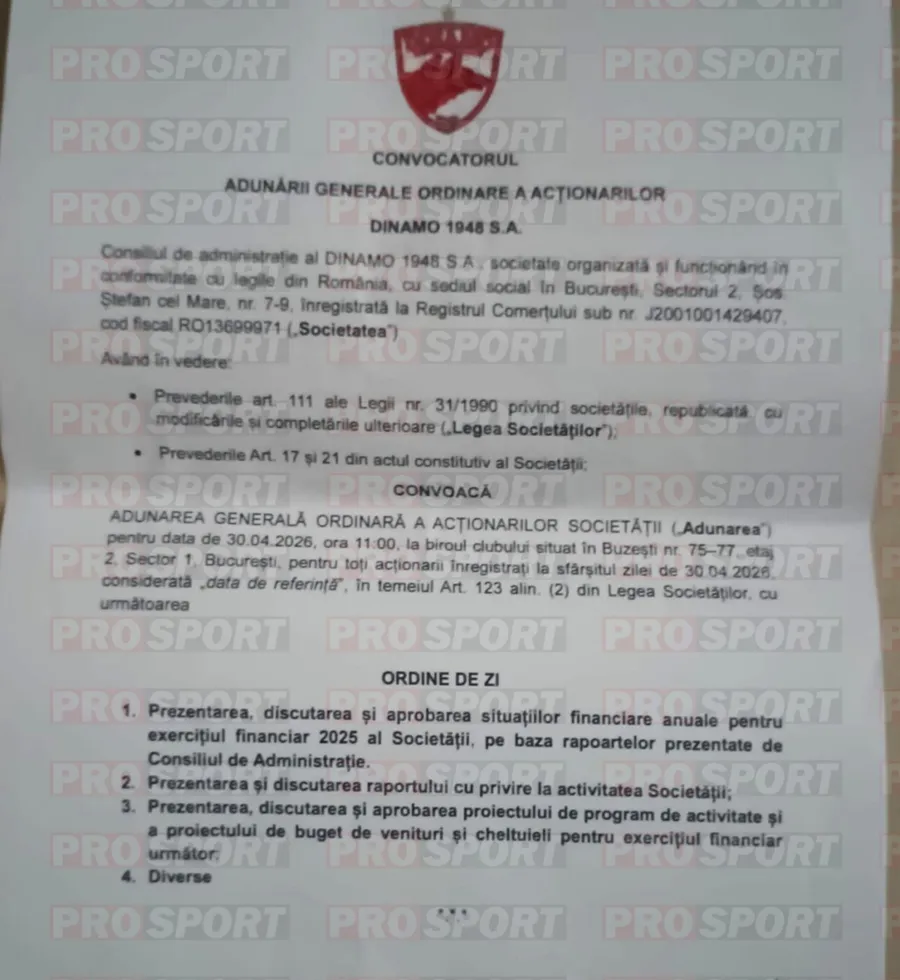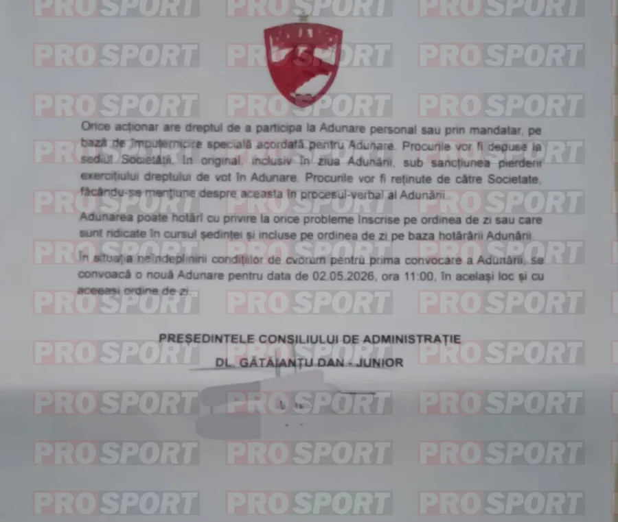 Vorbim de convocatorul Adunării Generale Extraordinare a Acționarilor SC Dinamo 1948 SA, AGEA care urmează să aibă loc la finalul lunii aprilie, mai precis la data de 30 aprilie, convocator care este semnat de Dan Gătăianțu din postura: „Președintele Consiliului de Administrație” (VEZI FOTO JOS). Până în prezent, după ieșirea din insolvență, atunci când a fost votat noul Consiliu de Administrație, Gătăianțu ocupa funcția de vicepreședinte, cea care ar fi fost preluată, în prezent, de Nicolescu.
