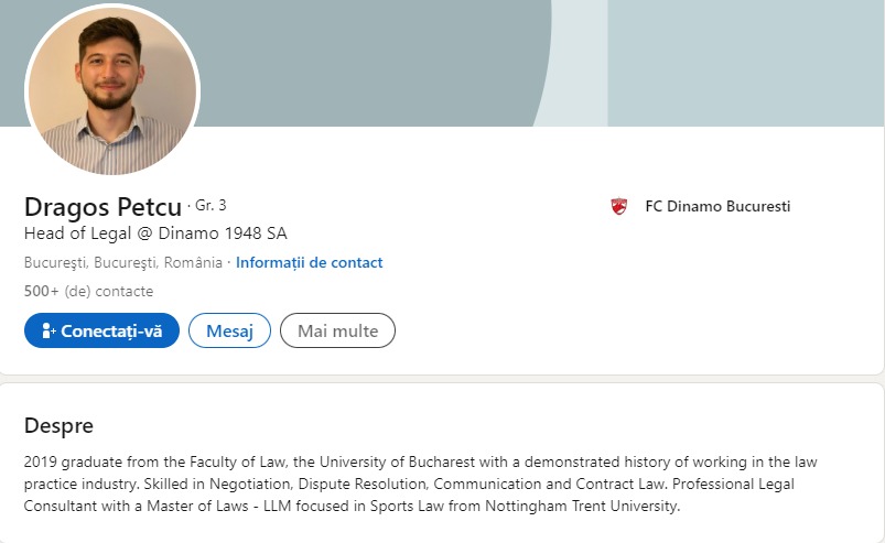 În acest sens există și ultimul exemplu, Dragoș Petcu, fost conislier juridic la Rapid, în perioada august 2020- februarie 2022. În prezent, Petcu este șeful departamentului juridic în cadrul SC Dinamo 1948 SA (VEZI FOTO conform Linkedin)