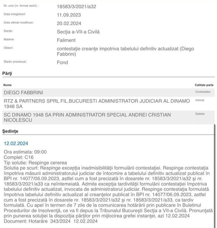 Avocatul lui Diego Fabbrini, fostul fotbalist al „câinilor” care a dus lupte dure în instanță cu administratorul judiciar al SC Dinamo 1948 SA, nu a făcut apel în urma hotărârii Tribunalului București în ultima „bătălie” dintre părți. Conform Legii Insolvenței, termenul a fost depășit, iar roș-albii au mai rămas cu o singură sarcină, Mircea Rednic.