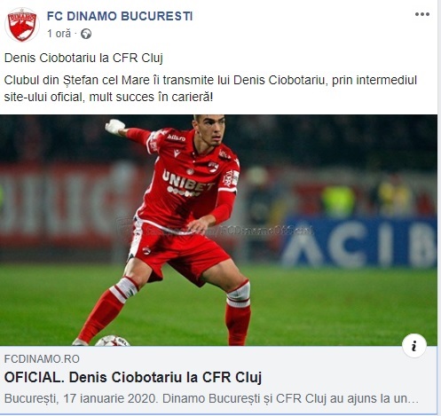 Dinamo „s-a trezit” să anunțe că Denis Ciobotariu s-a transferat la CFR Cluj la mai bine de 24 de ore după ce jucătorul a părăsit cantonamentul echipei. Oficialii clubului au confirmat tranzacția pe pagina oficială de Facebook și i-au urat succes fotbalistului.