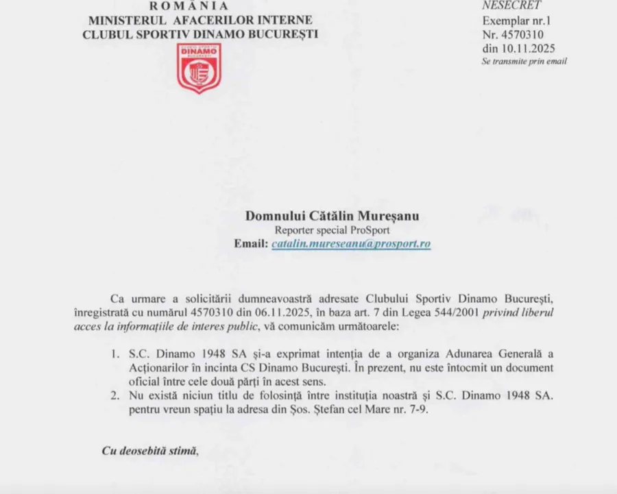 „Nu există niciun titlu de folosință între instituția noastră și SC Dinamo 1948 SA pentru vreun spațiu la adresa Șoseaua Ștefan cel Mare nr. 7-9”.