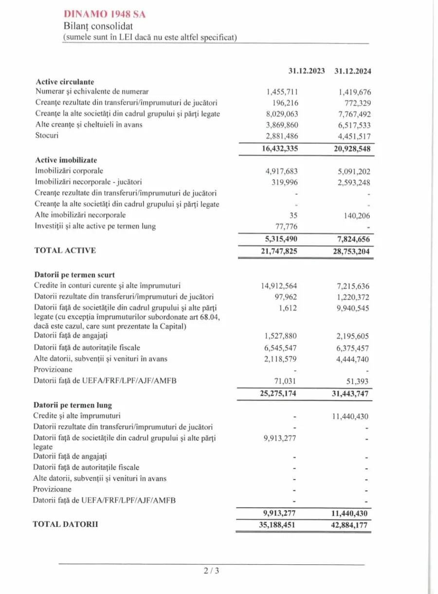 • 42.884.177 lei este totalul datoriilor menționat de Dinamo în raportul financiar al anului 2024