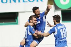 Alexandru Tudorie (S) si Ricardinho (C), de la FC Voluntari, reactioneaza dupa inscrierea unui gol in timpul meciului de fotbal contra echipei CS Concordia Chiajna din etapa a III-a a play-out-ului Ligii 1, disputat pe stadionul Concordia din Chiajna, duminica, 31 martie 2019. GEORGE FILIP / MEDIAFAX FOTO