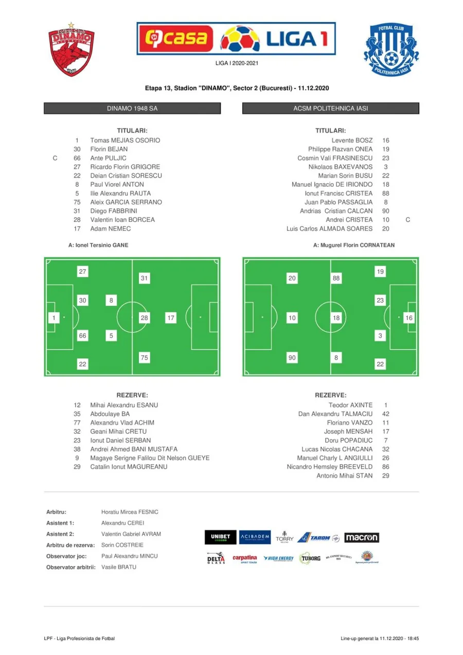 Dinamo: Mejias – Sorescu, Puljic, Bejan, R, Grigore – Răuță, P. Anton – Aleix Garcia, Borcea, Fabbrini – Nemec