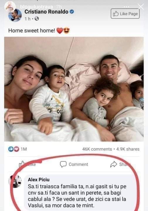 Cristiano Ronaldo este foarte urmărit pe rețelele de socializare, iar portughezul din ofensiva lui Juventus postează des fotografii alături de familie. Fostul atacant al lui Real Madrid ar fi fost însă și ironizat de un român, iar mesajul a devenit repede viral pe Facebook.