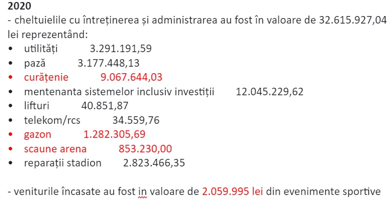 Peste 32,6 milioane de lei reprezintă suma pentru cheltuielile cu întreținerea și administrarea Arenei Naționale în anul 2020, anul în care au avut loc ultimele alegeri locale, câștigate de către Nicușor Dan.