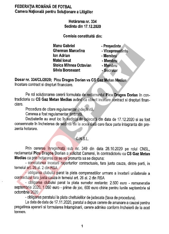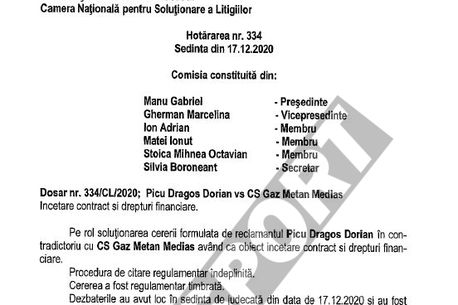 Camera Națională de Soluționare a Litigiilor din cadrul Federației Române de Fotbal i-a dat dreptate lui Dragoș Picu, iar clubul Gaz Metan Mediaș este obligat să îi plătească tot contractul.