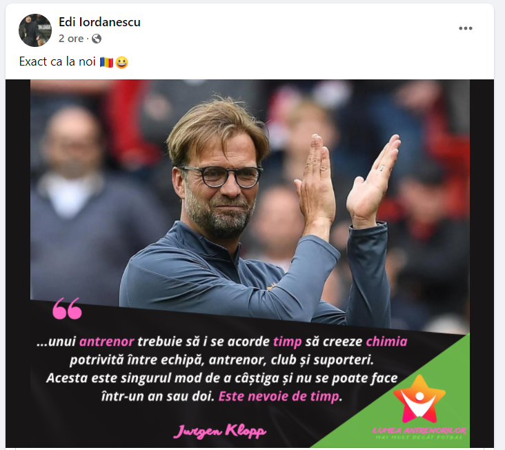 Edi Iordănescu a distribuit pe contul său de Facebook o declarație făcută de Jurgen Klopp ldespre viața unui antrenor și modul în care poate face performanță, iar din mesaj reiese faptul că un tehnician are nevoie de cel puțin doi ani ca să poată să ducă echipa la cel mai bun nivel.