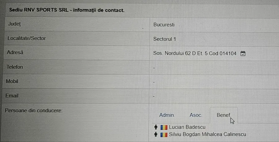 În legătură cu RNV Sports SRL oferim o informație în premieră. Conform datelor oficiale colectate de pe portalul listafirme.ro, care folosește informațiile înregistrate la Registrul Comerțului, beneficiarii RNV sunt oamenii de afaceri Silviu- Bogdan Mihalcea- Călinescu, respectiv Lucian Bădescu! (FOTO JOS)
