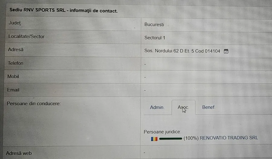 RNV Sports SRL este deținută, în proporție de 100%, de Renovatio Trading (FOTO JOS).