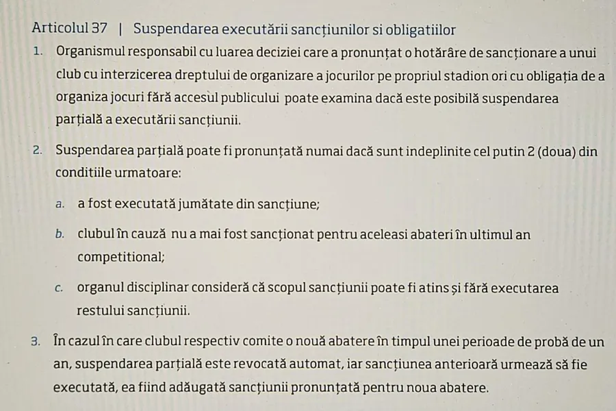 Ultima informație a fost legată de șansa „câinilor” agățată în paragraful articolului 37 din Regulamentul de Disciplină legat de suspendarea… suspedării. Dacă la Comisia de Recurs, juriștii clubului nu au avut succes, iar decizie „CDE” a rămas în picioare, de data asta dinamoviștii au jubilat.