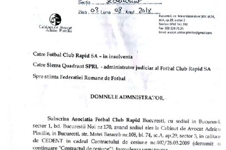 Paginile 1 și 3 din Contractul de Cesiune inventat de Copos și semnat, în 2009, de Taban și Sichitiu, prin care AFC Rapid primește înapoi drepturile sportive ale FC Rapid dacă aceasta din urmă își încetează activitatea. Documentul a fost depus vineri la dosarul falimentului, iar AFC Rapid cere acum drepturile sportive înapoi, conform actului