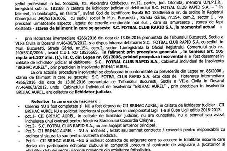 În plus, lichidatorul anunță cele două instituții că nu a împuternicit pe nimeni să înscrie Rapid în numele său în Liga 1.