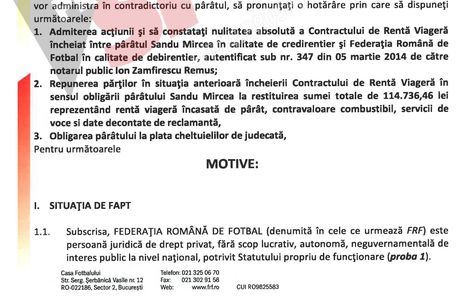 ProSport vă prezintă acum, în exclusivitate, și actul prin care FRF l-a acționat în judecată pe Mircea Sandu pentru recuperarea rentei viagere plătite deja.