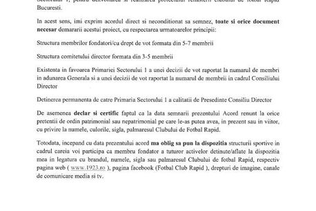 De asemenea, vă solicităm, ca pentru orice alte active asupra cărora dețineți drepturi (pagina web www.1923.ro pagina facebook Fotbal Club Rapid, etc) să vă dați acordul pentru punerea la dispoziție a acestora, structurii sportive ce va dezvolta proiectul renașterii echipei de fotbal Rapid București.