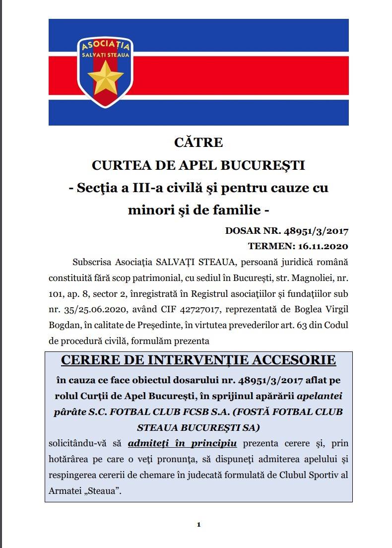 „Așa cum am promis încă de la înființare, în conformitate cu scopul Asociației noastre, am efectuat demersul judiciar la care ne-am angajat, prin formularea unei cerere de intervenție accesorie în sprijinul apărării fostei societăți SC FC Steaua București SA, cerere prin care am supus atenției Curții de Apel București argumentele care ne-au condus și pe noi să considerăm că echipa din Liga I este veritabilă continuatoare a echipe de legendă Steaua București”, se spune într-un comunicat al asociației.