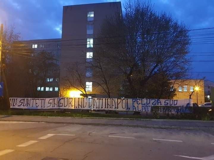 Craiovenii au crezut că este meci în oraș. Fanii olteni au aprins torțe în fața Spitalului de Boli Infecțioase „Victor Babeș” din Craiova. „Nu sunteți singuri, nu dați înapoi, Peluza Sud alături de voi!”, au fost mesajele de pe bannerele pe care le-au pus pe gardurile unității medicale. A fost modul prin care și-au arătat susținerea și mulțumirea pentru cadrele medicale care au grijă de cei care sunt infectați de virusul care a speriat lumea întreagă.