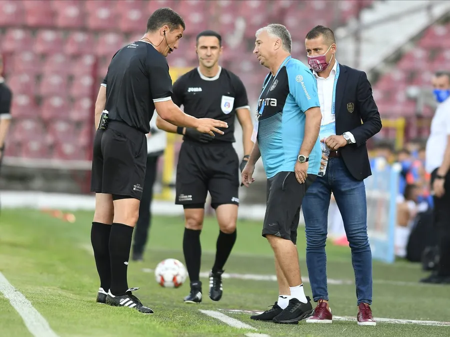 Arbitrul central Istvan Kovacs alaturi de Dan Petrescu si Cristian Panin in meciul de fotbal dintre CFR Cluj si Universitatea Craiova, contand pentru play-off-ul Ligii 1 Casa Pariurilor, disputat pe Stadionul Dr. Constantin Radulescu din Cluj Napoca, duminica 28 iunie 2020. © FOTO:Razvan Pasarica/SPORT PICTURES