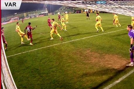 În minutul 67 al partidei de la Mioveni, Emmanuel Yeboah a fost lovit în picior de către Garutti, după un corner, însă arbitrul nu a sesizat nimic. După protestele vehemente ale ardelenilor, centralul Horia Mladinovici a decis să meargă la monitorul VAR pentru a se uita mai amănunțit la fază.