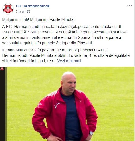 A.F.C. Hermannstadt a incetat astăzi înțelegerea contractuală cu dl Vasile Miriuță. „Tati” a revenit la echipă la începutul acestui an și a fost alături de noi în cantonamentul efectuat în Spania, în ultima parte a sezonului regulat și în primele 3 etape din Play-out.