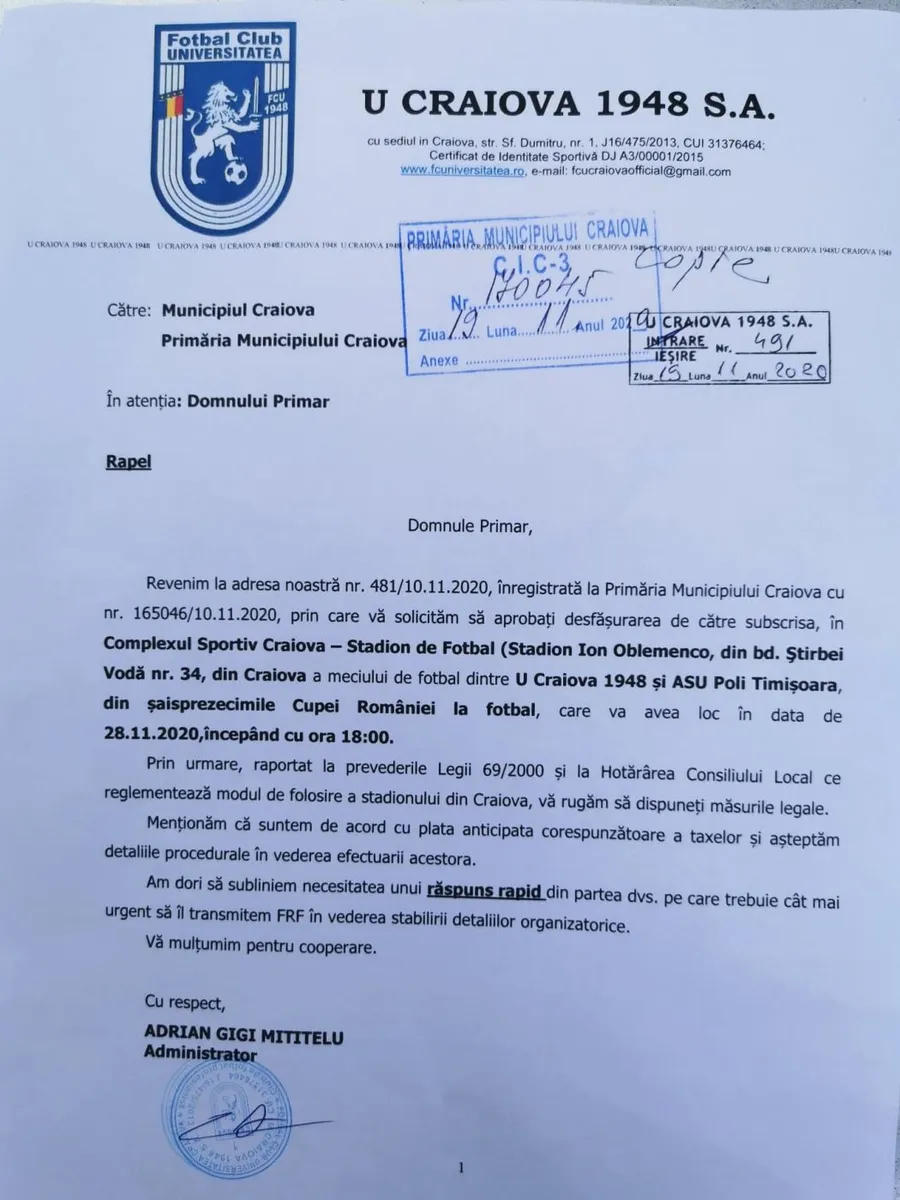 Conducerea lui FC Universitatea Craiova a primit un răspuns de la Primăria din Craiova, după ce în urmă cu câteva zile oficialii liderului Ligii 2 au solicitat oficial printr-o scrisoare către Olguța Vasilescu ca meciul cu ASU Poli Timișoara alb-albaștrii să îl dispute pe stadionul Ion Oblemenco.