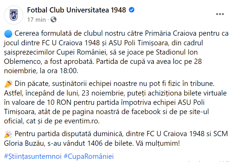 Televiziunea deținătoare de drepturi a stabilt partidele care se vor televiza din 16-imile Cupei României, jocul dintre FC Universitatea Craiova și ASU Poli Timișoara este unul dintre acestea. Meciul se va disputa pe 28 noiembrie, cu începere de la ora 18:00. Însă, nici până la această oră nu se știe stadionul unde va avea loc meciul respectiv, deși oltenii vor să joace pe arena Ion Oblemenco.