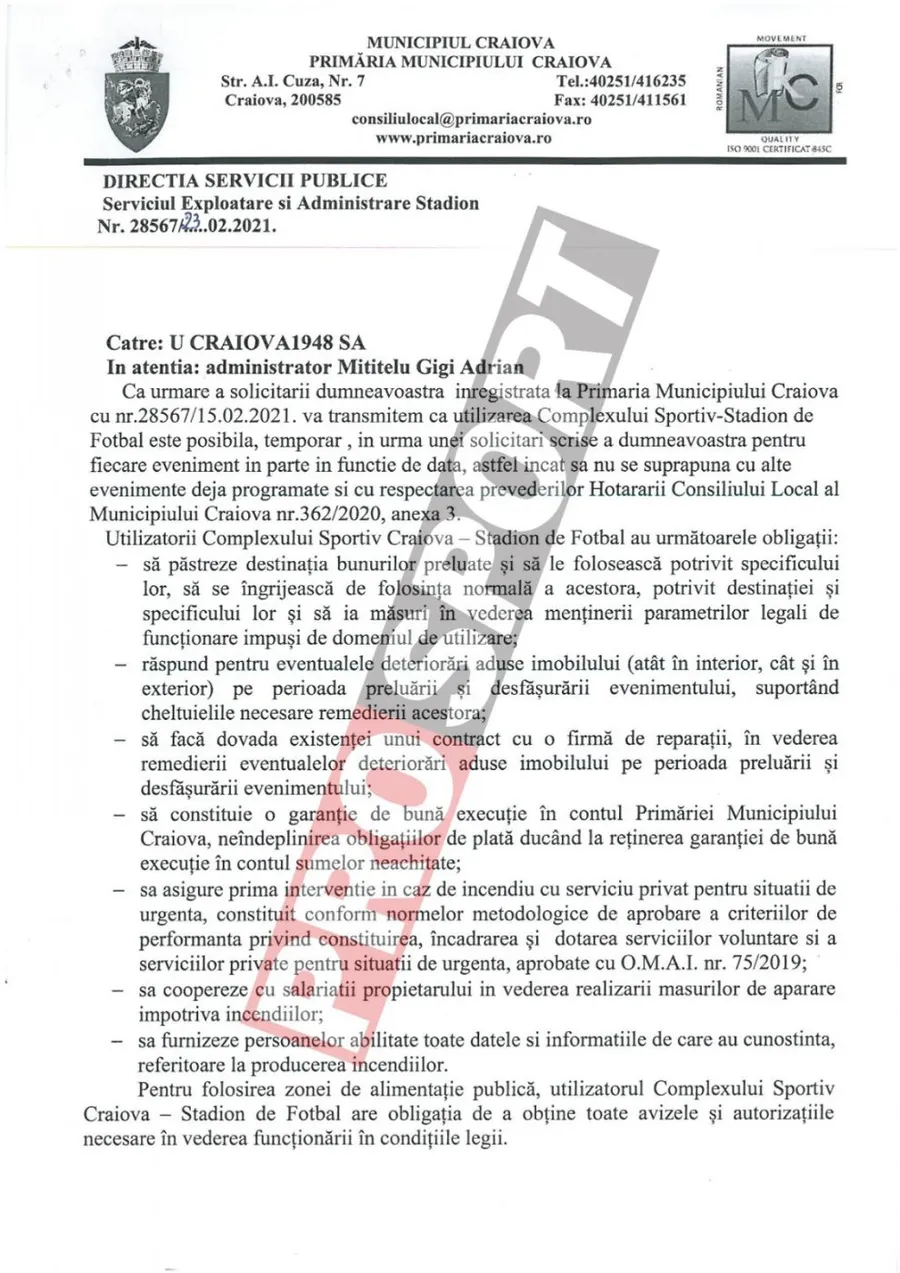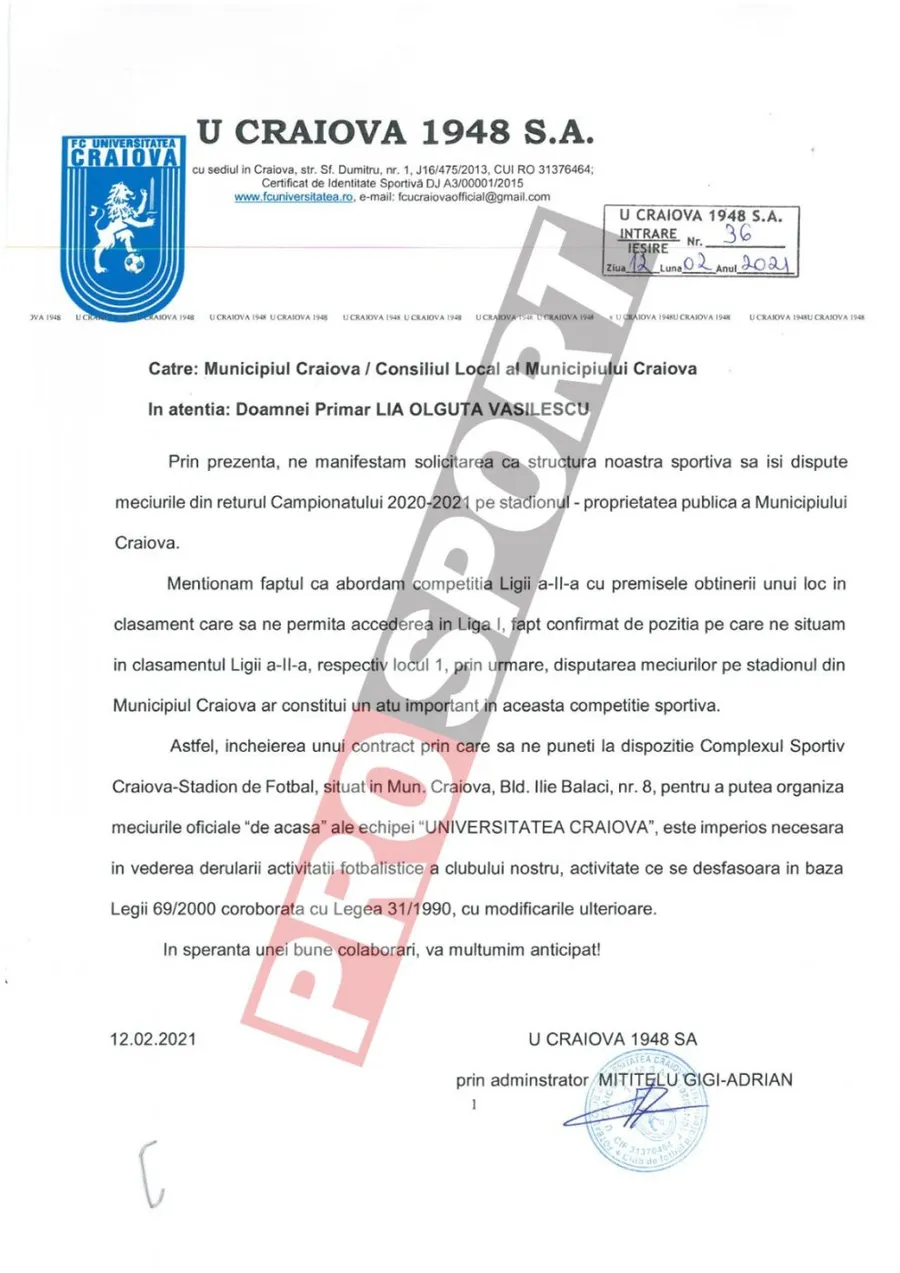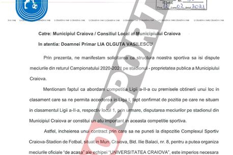 ProSport a aflat că zilele trecute oficialii celor de la FC Universitatea Craiova s-au întâlnit la Primăria din Bănie cu reprezentanții acestei instituții și au pus la punct detaliile organizării partidei cu Mioveni. Șefii alb-albaștrilor au făcut cerere scrisă pentru a putea disputa jocul cu Mioveni pe stadionul-emblemă al orașului (în data de 12.02.2021, cu numărul 36 – vezi facsimil).