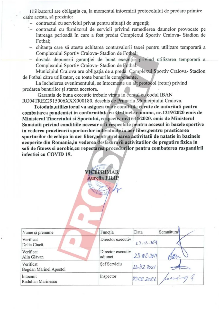 Pentru că toate condițiile au fost îndeplinite de clubul leilor din Bănie (gestionat în această perioadă de fiul acestuia, Adrian Mititelu jr), Primăria a răspuns pozitiv cererii oltenilor. Instituția publică a trimis un act, semnat de către Viceprimarul Aurelia Filip, dar și de către directorul executiv, Delia Ciucă, de către directorul executiv adjunct, Alin Glăvan, de către Șeful de Serviciu, Bogdan Marinel Apostol, și de către Inspectorul Radulian Marinescu (numărul 28567 din data de 23.02.2021 – vezi facsimil 2 și facsimil 3).