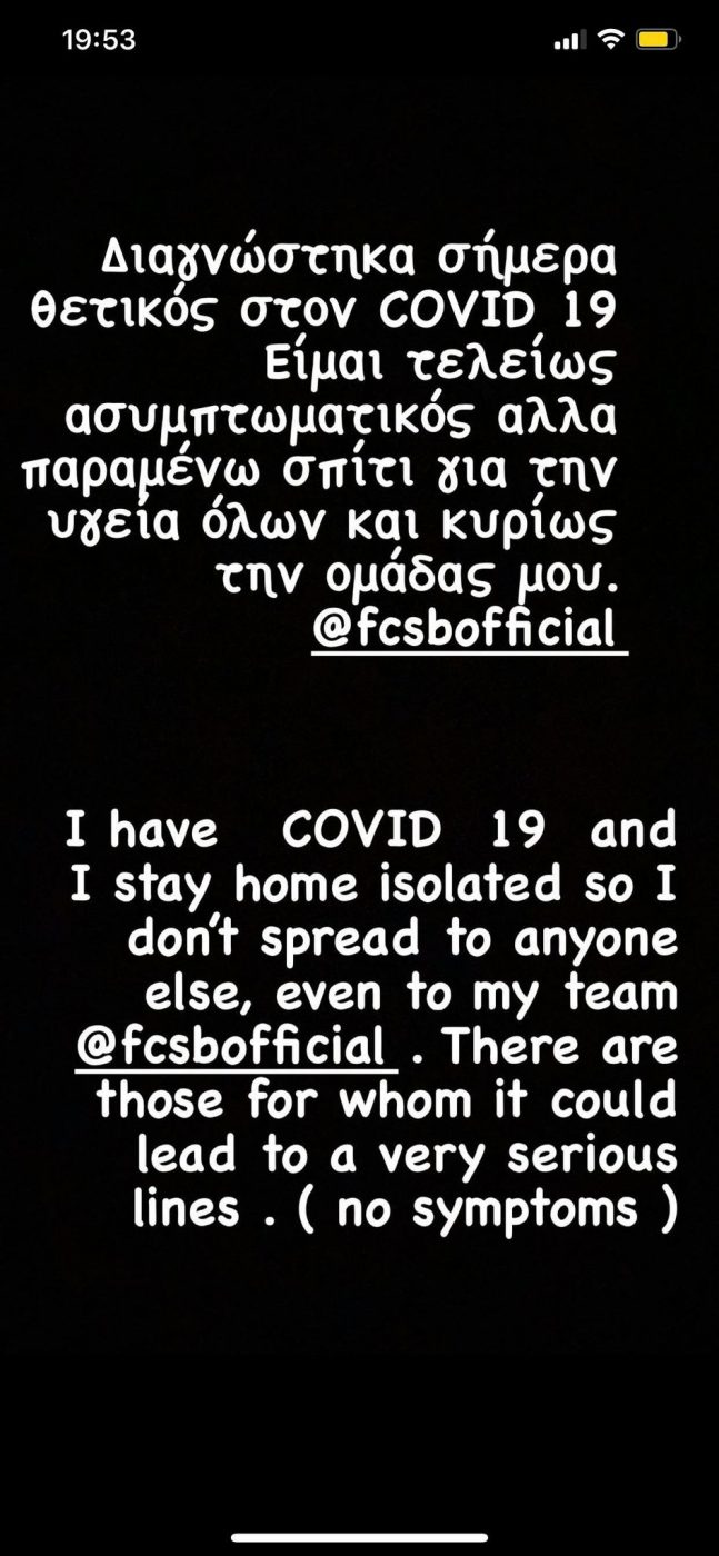 „Am covid-19 și stau izolat acasă ca să nu răspândesc la nimeni altcineva, nici la colegii mei de la FCSB. Sunt cei pe care i-ar putea duce la serioase probleme. Asimptomatic”, a scris Aristidis Soiledis pe contul său de Instagram.