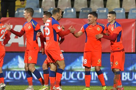 Jucătorii de la FCSB se bucură după un gol înscris în partida cu CS Mioveni