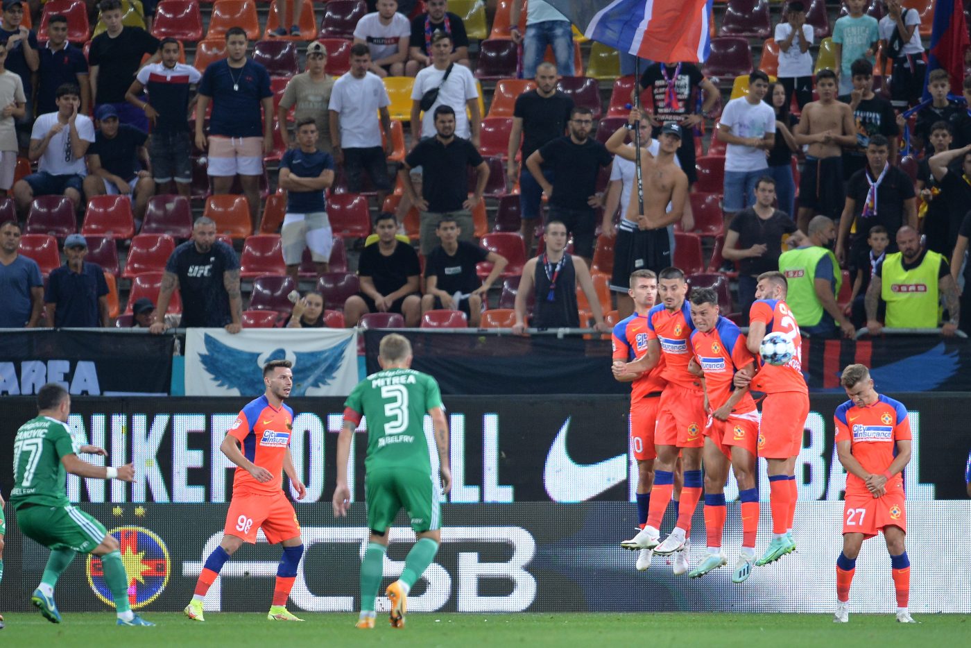 Min. 90+3: OCAZIE FCSB! Tănase trimite mult peste poartă dintr-o lovitură liberă.