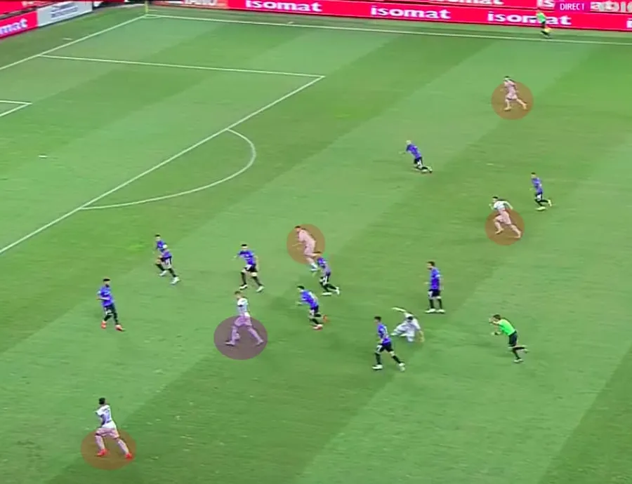 Ocazia imensă a lui Sergiu Buș din minutul 11 se datorează presingului mixt pe care FCSB îl aplică în treimea adversă care oferă posibilitatea lui Florin Tănase ( albastru ) de a intercepta o pasă în apropierea careului