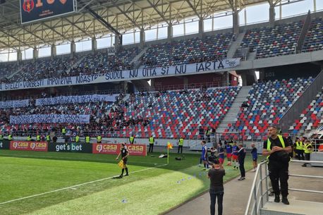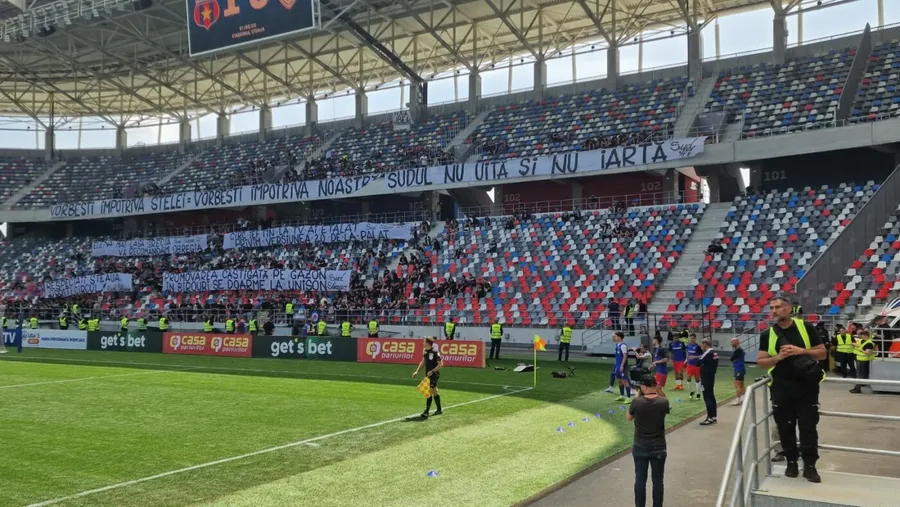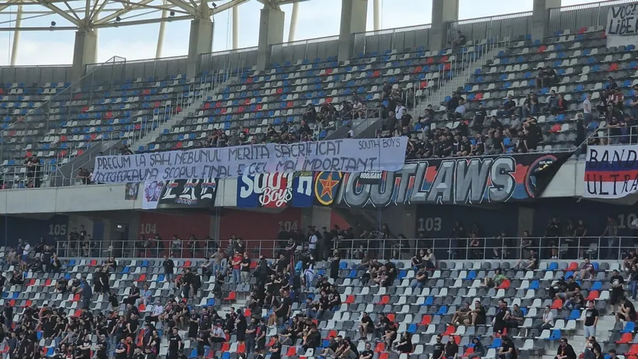 Apoi a venit rândul peluzei Sud. Ultrașii au împânzit sectorul rezervat cu mai multe bannere, iar mesajul a fost același, de oprobriu la adresa lui Florin Talpan. „Vorbești împotriva Stelei, vorbești împotriva noastră, Sudul nu uită și nu iartă”. „Circ ieftin la tv ai etalat, privim versiunea 2.0 de la Palat”, „Precum la șah, nebunul trebuie sacrificat, întodeauna scopul final e cel mai important”.