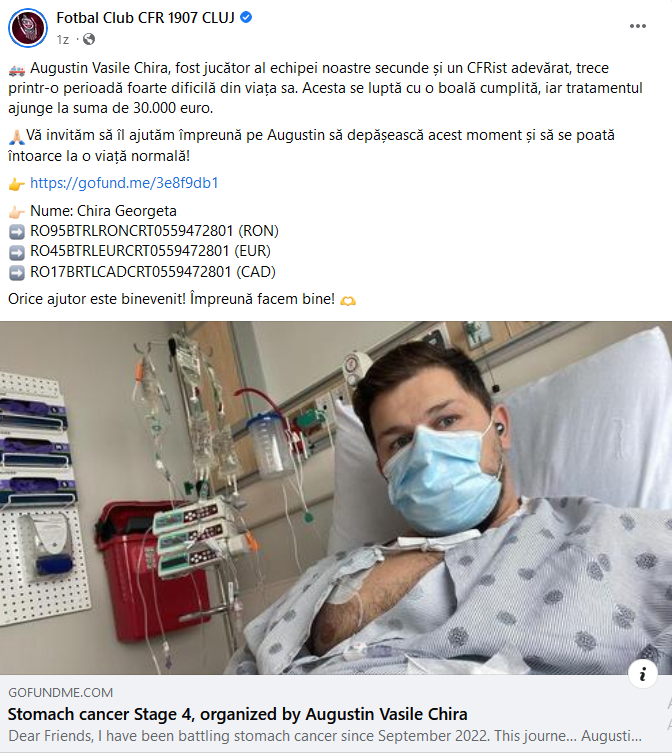 Augustin Vasile Chira, fost jucător al echipei noastre secunde și un CFRist adevărat, trece printr-o perioadă foarte dificilă din viața sa. Acesta se luptă cu o boală cumplită, iar tratamentul ajunge la suma de 30.000 de euro. Vă invităm să îl ajutăm împreună pe Augustin să depășească acest moment și să se poată întoarce la o viață normala! Orice ajutor este binevenit! Împreună facem bine”