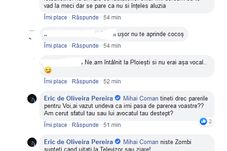 „Slăbește și treci la joc”, a fost unul dintre comentariile care au stârnit cele mai multe reacții din parte alui Eric, dar și a altor oameni care-l urmăresc pe brazilian pe rețelele sociale. Eric a răspuns cu mai multe ironii sau chiar jigniri. „Mănânc o șaorma și mă întorc!” sau „Cred că tu ai mai multă nevoie” au fost câteva dintre răspunsurile fotbalistului de la Viitorul.