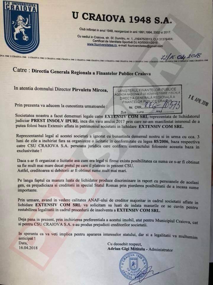 Adrian Mititelu a făcut o primă solicitare, pentru stadionul Extensiv, către EXTENSIV COM/ PREST INSOLV IUPRL, la data de 16.04.2018, în care semalat că nu este ok să i se dea celor de la CSU dreptul de folosință pentru acest stadion, pentru echipa a doua și grupele de juniori, fără licitație publică. FC U Craiova a dorit să joace și ea pe acest stadion.