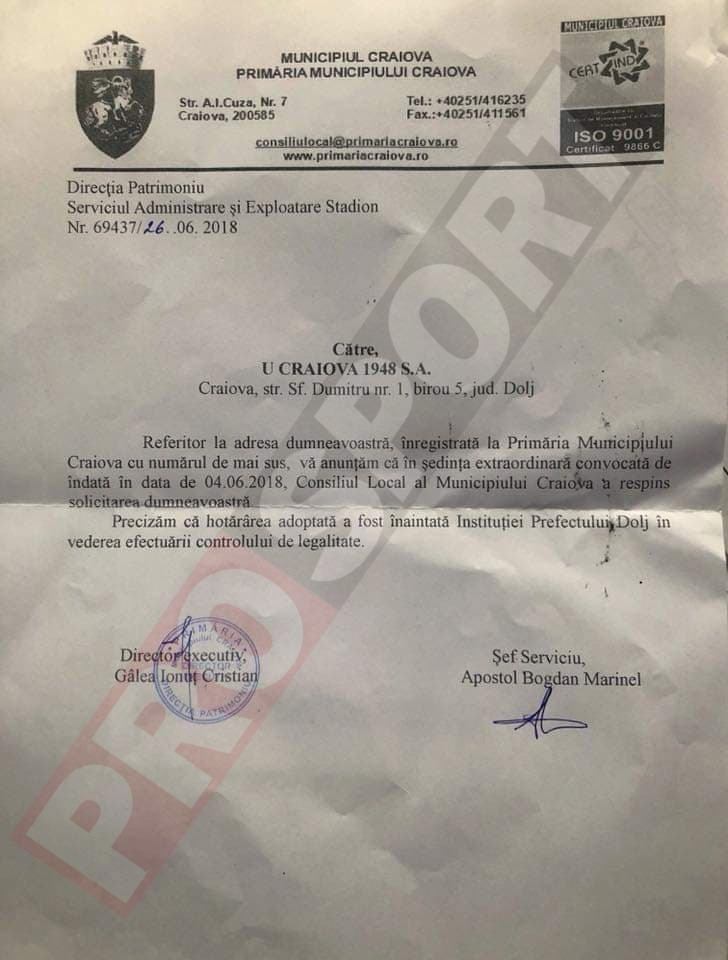 Nu în ultimul rând, Adrian Mititelu a cerut să i se dea dreptul lui FC Universitatea Craiova să joace pe stadionul Oblemenco, dar acolo Primăria Craiova i-a transmis printr-o înștiințare că cererea lui FCU a fost refuzată.
