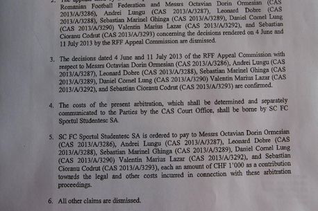 Octavian Ormenișan, Andrei Lungu, Leonard Dobre, Sebastian Ghinga, Daniel Lung, Valentin Lazăr și Codruț Cioranu au primit câștig de cauză din partea TAS, iar Vasile Șiman este obligat să le achite salariile pe un an.