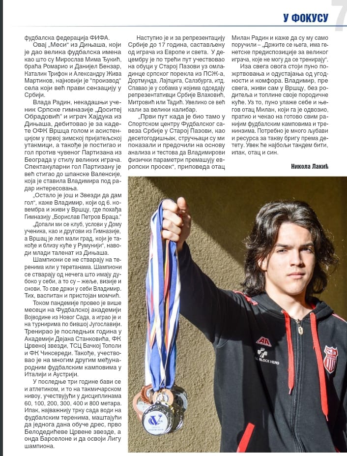 Tatăl lui Vladimir Radin mai subliniază: ”La acțiunile cu lotul Serbiei au venit cu sugestia să-l mutăm din postul de vârf pe extremă, unde-l recomandă mai bine calitățile, în special viteza. Copilul îmi și spune câteodată că i se pare că adversarii stau pe loc în timp ce se lansează în câte o cursă”.