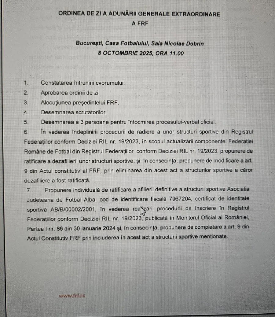 În luna iulie, la FRF au fost organizare două Adunări Generale Ordinare. După cum a informat Gsp.ro la acel moment, prima ședință a avut loc în ziua de 9 iulie, când au fost convocate structurile înscrise în Registrul Federațiilor (propuse spre dezafiliere acum) și o alta a doua zi, când s-au prezentat structurile care urmează a fi afiliate.