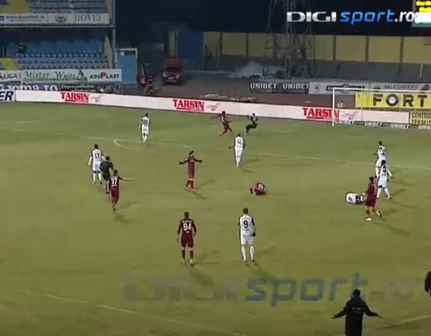 Min. 22- Fază ciudată, CFR Cluj cere penalty! Duel între Deac și Droppa la 25 de metri de poartă, arbitrul lasă jocul să continue, mingea ajunge în careu și clujenii cer penalty la intervenția lui Pleșca asupra lui Omrani. Arbitrul Andrei Chivulete întoarce meciul și dă lovitură pentru Gaz Metan considerând că Deac a faultat.