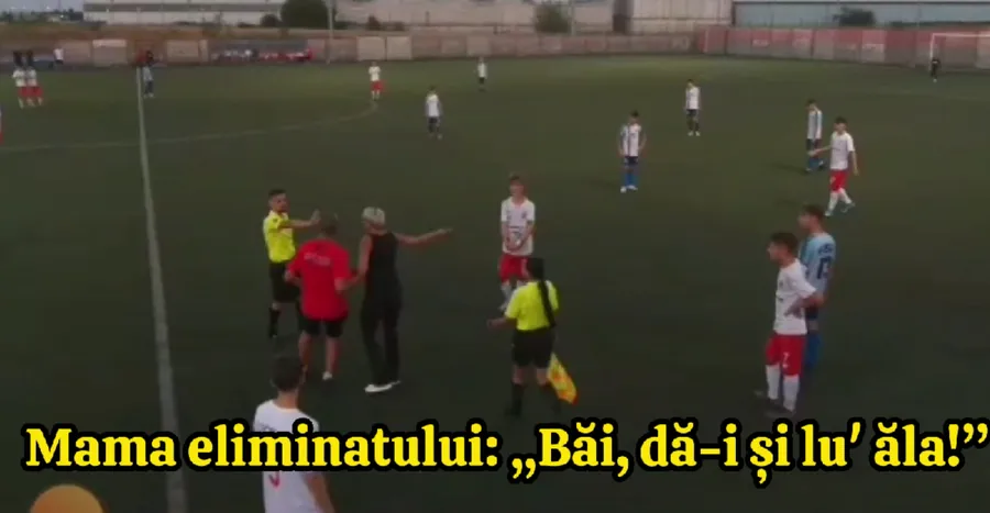 Și femeia continuă, dar trece la nivelul următor și zguduie gardul care o ține departe de a-l linșa pe arbitru: „Băi, dă-i, bă și lu’ ăsta!”. Pe imagini se vede cum mama tânărului eliminat care abia și-a făcut buletinul zguduie nervoasă gardul.