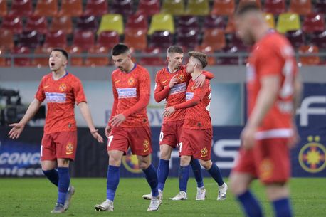 Fotbalistii stelisti Octavian George Popescu, Adrian Gheorghe Sut si Andrei George Miron se bucura dupa un gol marcat de catre Olimpiu Vasile Morutan in meciul de fotbal dintre FCSB si CFR Cluj, contand pentru Liga 1 Casa Pariurilor, desfasurat fara spectatori pe Arena Nationala din Bucuresti, vineri 19 martie 2021. © FOTO:Razvan Pasarica/SPORT PICTURES